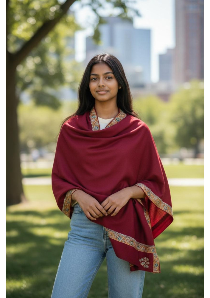 An elegant red stole for formal occasions, handcrafted in Kashmir.
