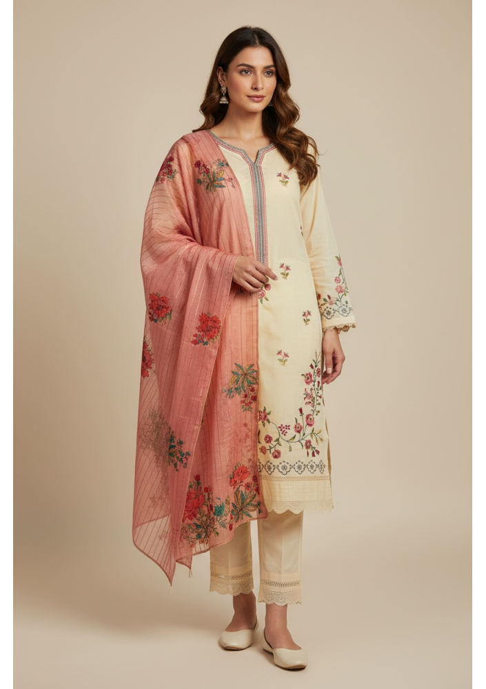 Color: Cream with Peach Floral Dupatta